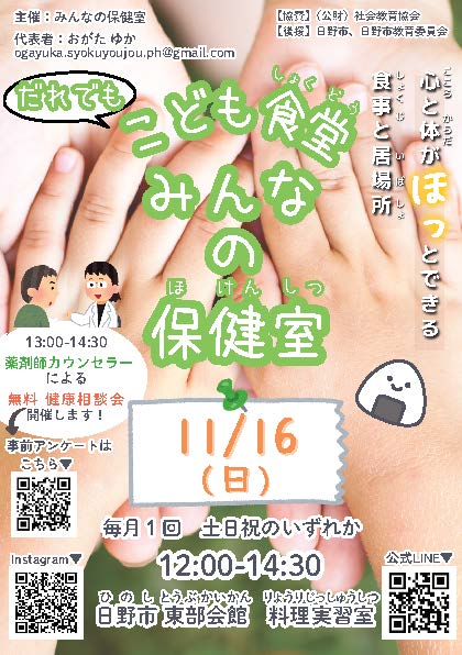 | 参加費 | 入場無料 食事代:こども無料/大人500円 (薬剤師カウンセラーによる30分無料相談券をプレゼント) 健康相談会は無料です。 |